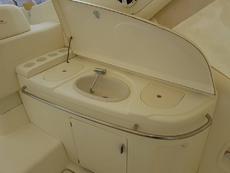 Down below her two cabins & saloon are beautifully styled with gloss cherry woodwork throughout & she has a well equipped galley and separate bathroom. This is a very sociable boat as her cockpit has seating for up to 10 adults & she has a wet bar with sink & drinks fridge